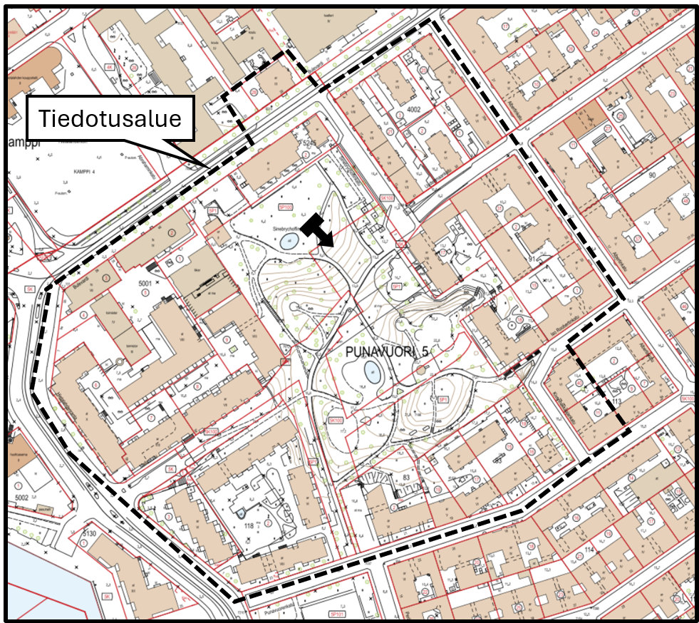 - sunnuntaina 17.8.2025 kello 14.00 - 23.30 - Tapahtumaa koskeva tiedote on jaettava ennen tapahtuman alkamista alla olevaan karttaan (kuva 1) merkityn tiedotusalueen jokaisen rakennukseen. Tiedote on jaettava vähintään jokaiseen porraskäytävään, mutta mieluiten jokaiseen asuin- ja liikehuoneistoon. Puiston reunalla mukaan lukien Sinebrychoffinkadulla sijaitsevissa asuinrakennuksissa tiedote on jaettava jokaiseen asuinhuoneistoon.
