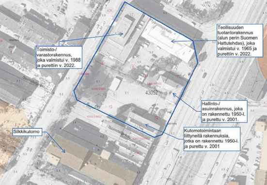 Asemakaavassa (12481) alue on osoitettu keskustatoimintojen korttelialueeksi, jonne saa sijoittaa asumista (C-1). Kaavassa on määrätty pilaantuneen maaperän puhdistamisesta. Korttelin eteläosassa sijainneet rakennukset (1950-luvulla valmistunut Suomen Silkkikutomo Oy) purettiin vuonna 2021. Pohjoisosassa sijainneet viimeiset kaksi rakennusta purettiin vuonna 2022. Alue ja sen rakennukset vuoden 1993 ilmakuvan päällä on esitetty alla kuvassa). Pohjoisosan vanhin rakennus oli vuonna 1965 valmistunut Suomen Hattutehdas, jossa on historiatietojen perusteella ollut öljylämmitys. Maanalaista öljysäiliötä ei ole todettu tehdyissä maaperätutkimuksissa.